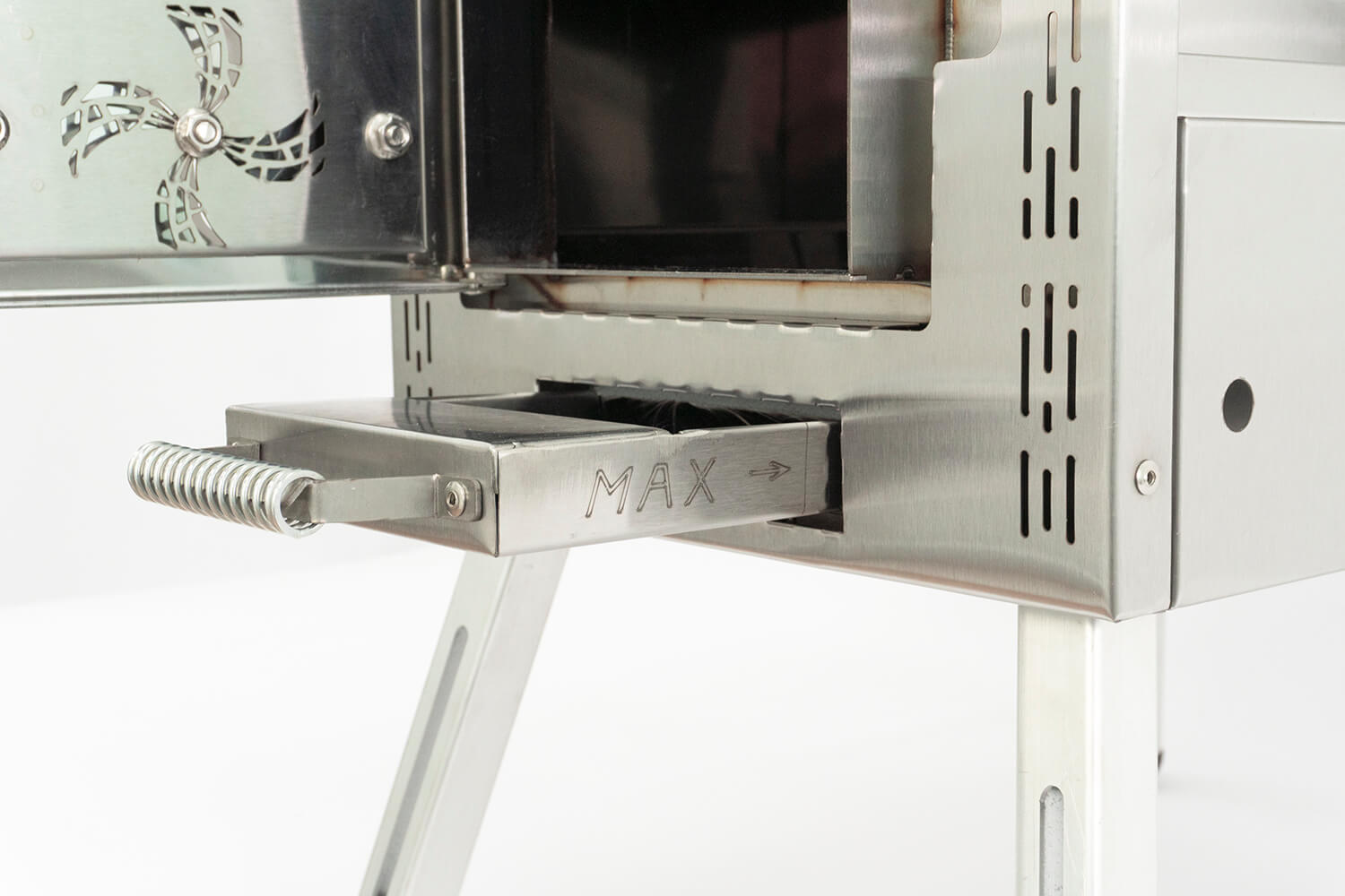 This mode is achieved when both the ash pan is pulled out to the MAX mark located on the right-side wall of the ash pan and the rotating disc is opened fully.