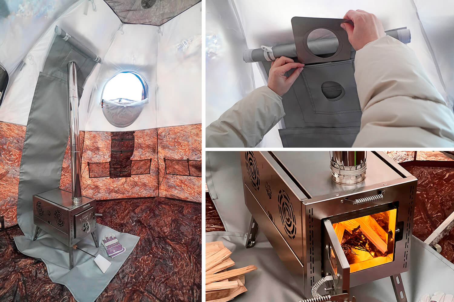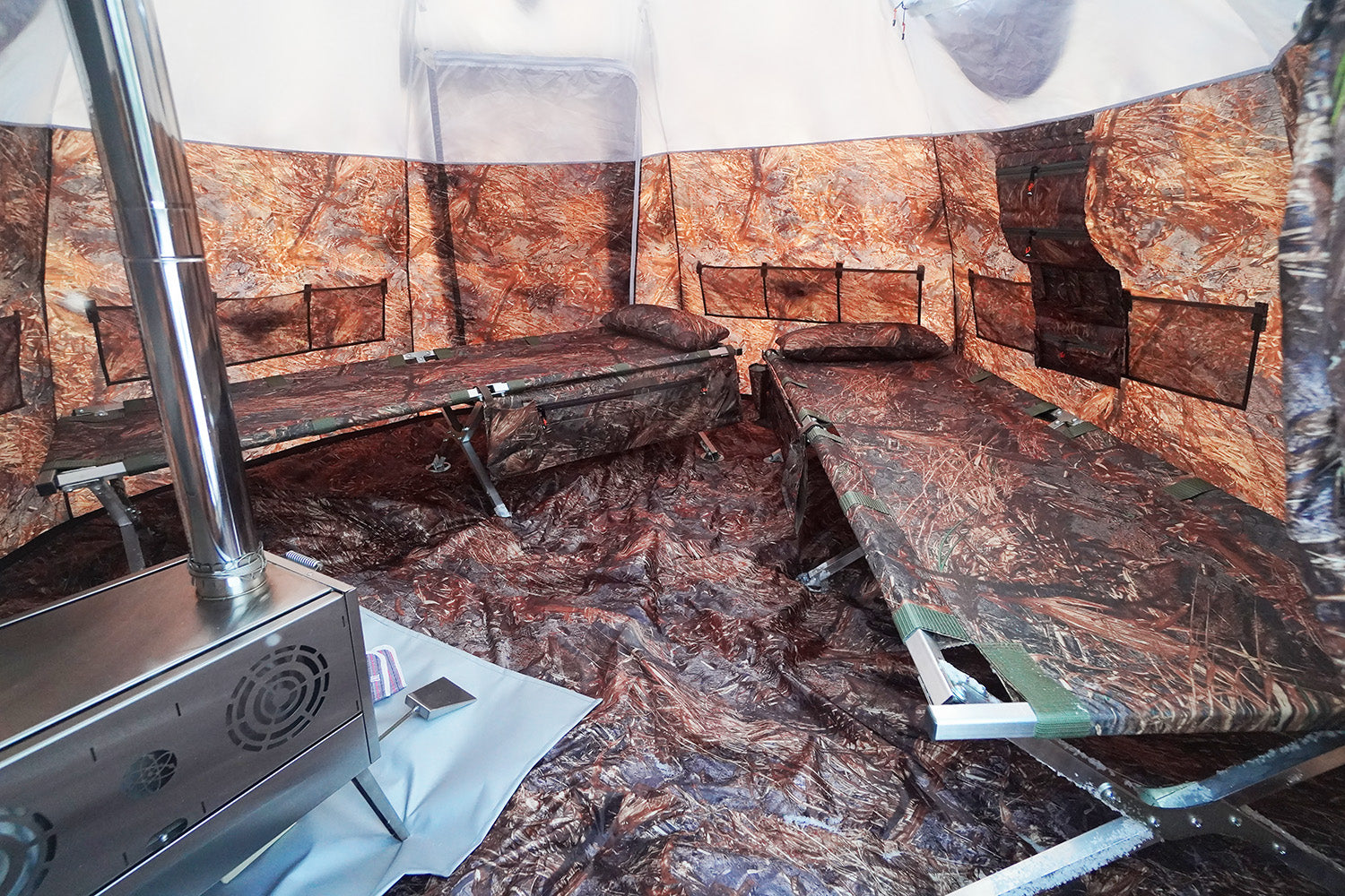Arctic Cape (Optional): For extremely low temperatures (below -25°C). Duplicates main tent with windows, entrance, and stove jack. Features Oxford 300 fabric with additional insulation layer.