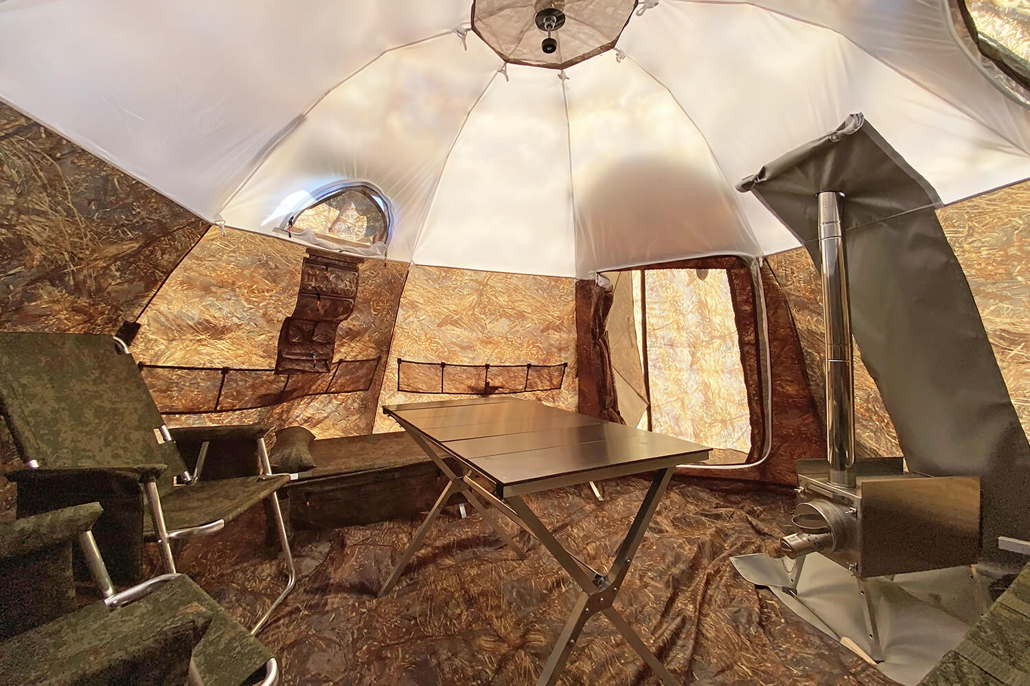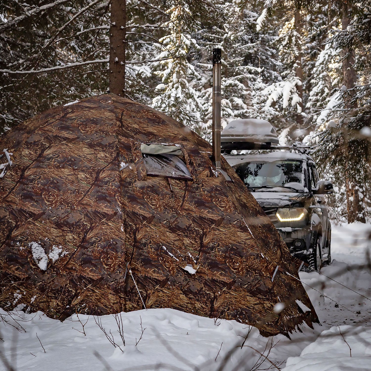 The PFBereg UP-5 is a revolutionary 4-season pop-up tent with an innovative built-in aluminum frame that sets up in just 1 minute. Designed for 3-5 people with a wood stove and folding beds (or up to 11 in sleeping bags), this dome-umbrella tent combines exceptional ease of setup with superior cold-weather performance.