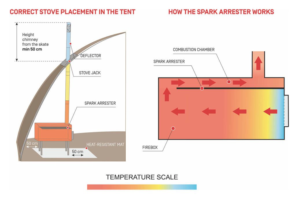 - Spark arrester is located inside the firebox, dividing it into two sections. It extends the burning time of firewood to 6-8 hours, enhances heat distribution in the tent and protects the outer fly from sparks.